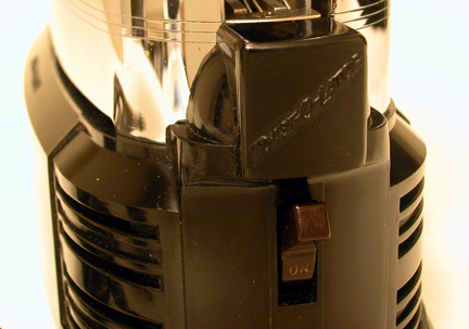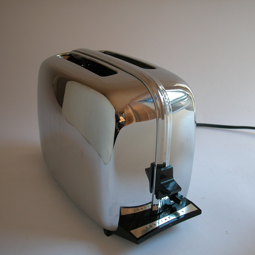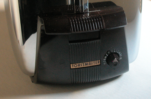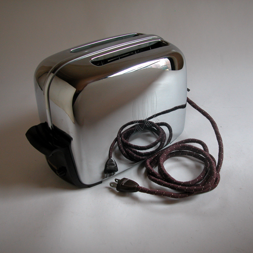 Toastmaster Super De Luxe Powermatic ToasterThis model Toastmaster began production in the early 1950s in competition with the popular Sunbeam model with radiant control which also lowers the bread automatically.This toaster has no lever to push down to begin toasting. Just drop a slice or two of bread and the carriage lowers and the toasting begins. It turns off automatically when the toast is finished and the slices rise up ready for buttering. The initial production of this model was nicely signed on the front. This later model changed to an incised signature. It has the familiar Toastmaster cartouche on each side. The only control is the light/dark dial which serves as a panic button when pushed in to end the toasting early. This one is in excellent condition with minor cosmetic flaws. It has been cleaned top to bottom then fitted with a new replacement cord and plug, good for another decade of service making toast. N.B. Especially not suited to toasting thick slices. Toastmaster Super De Luxe Powermatic