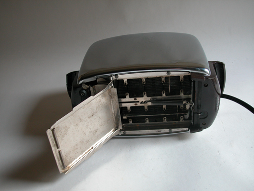 Toastmaster from the late 1950sThis model Toastmaster began production in the late 1950s and continued on into the 1960s. The basic guts are very similar to the hugely popular model that came out after WWII, but the feet and fittings were streamlined and made easier to assemble.This sturdy toaster has a heavy steel case with chromium plating. This one is in very good condition. I've repaired a break in the handle on the cord end. It isn't apparent except the bottom side. It has been cleaned inside and out then fitted with a new replacement cord and plug, good for another decade of service making toast. Toastmaster from the late 1950s