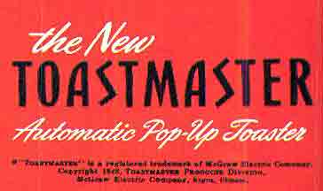 Toastmaster Products Division McGraw Electric Company, Elgin, Illinois U.S.A. 110-120 Volts 10.5 Amps. UL Operates on A.C. or D.C. |
