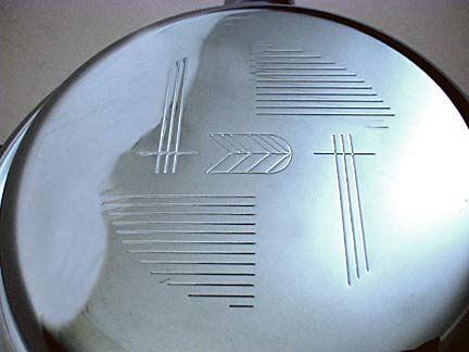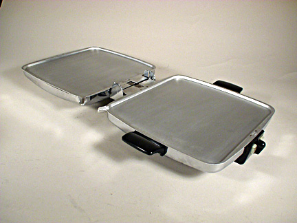 Sunbeam CG Waffle IronIn the mid 1950s, Sunbeam restyled the popular Model W-2 waffle iron and created the sleek, modern looking Model CG. The new model retained the high quality construction of its predecessor. The CG model has near commercial quality components including a sensitive, accurate temperature controller and heavy duty 1250 watt heating elements that can cook acres of waffles in minutes. An easy to see illuminated control dial takes all of the guesswork out of the baking process and frees the cook from squinting at a tiny indicator window. It weighs in at an impressive 11 pounds. Outside dimensions including handles is fourteen inches square and four and a half inches high. Each nine inch square waffle easily breaks into quarters -- the perfect size for storing and freezing, and for quick re-heating in a toaster. Please note that the waffle iron in mint condition is like new and unused but may have some small cosmetic imperfection. Sunbeam Corporation, Chicago, USA, Toronto, Canada